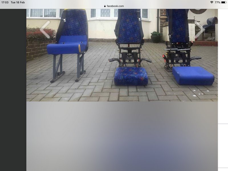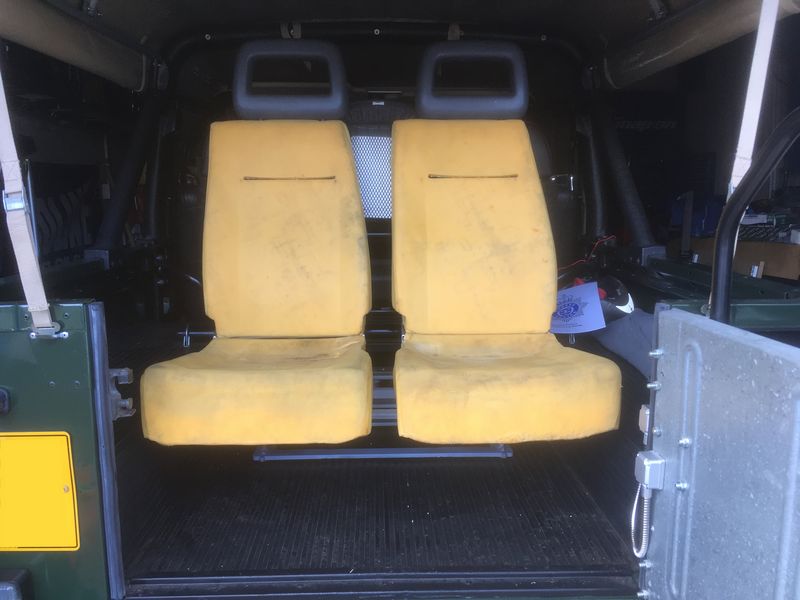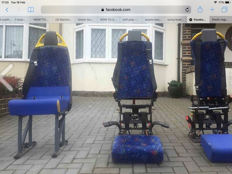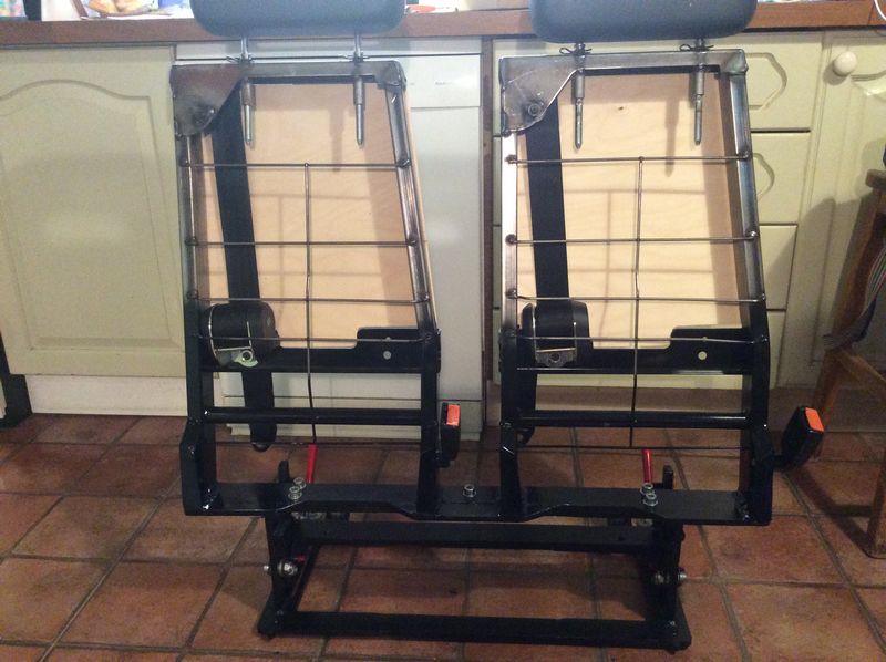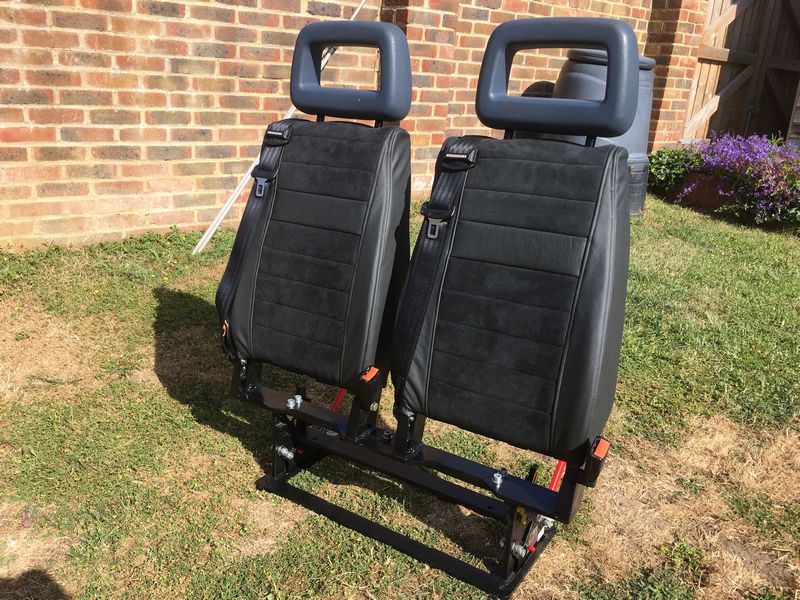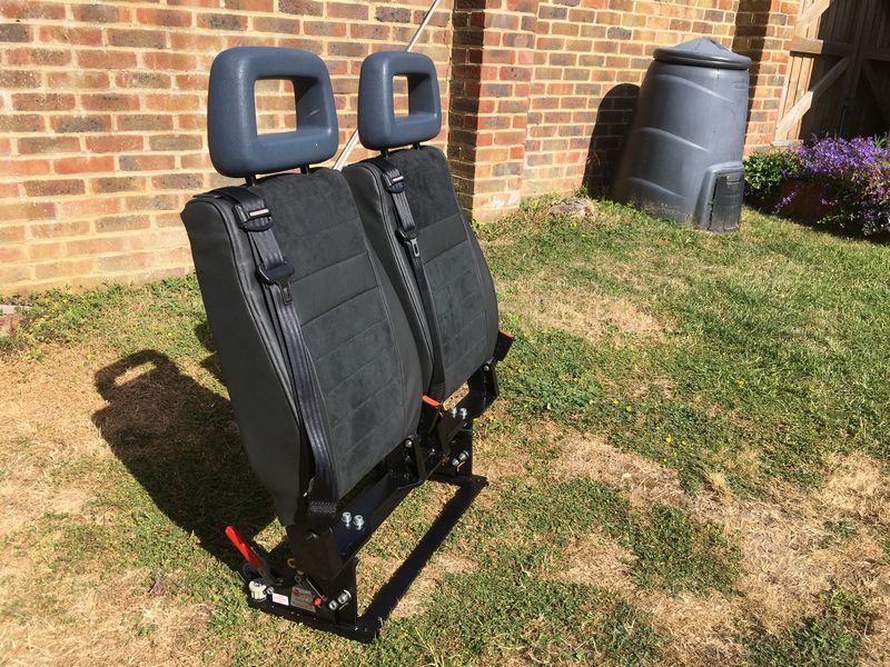 Traditional sideways benches are unsafe. Other 'transit' type seats are far too high. Bolting in a rear bench gives little adaptability and there remains no capacity for adding good seatbelts. The plan is to adapt WAV mobility seats to make a removable bench which is mounted via QR levers onto UNWIN tracking. The tracking will be chassis fixed. Seats have integral 3 way belts and due to UNWIN rails can be mounted forwards or rear facing. Seat squabs are also QR.